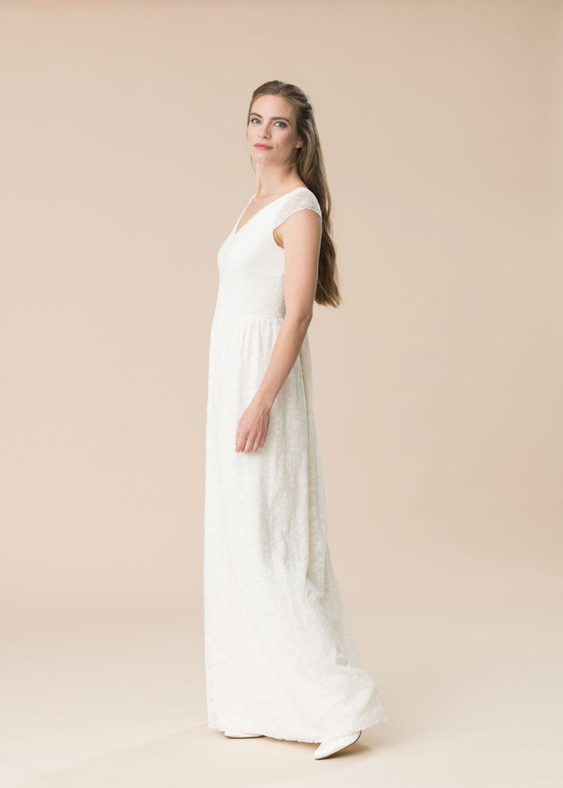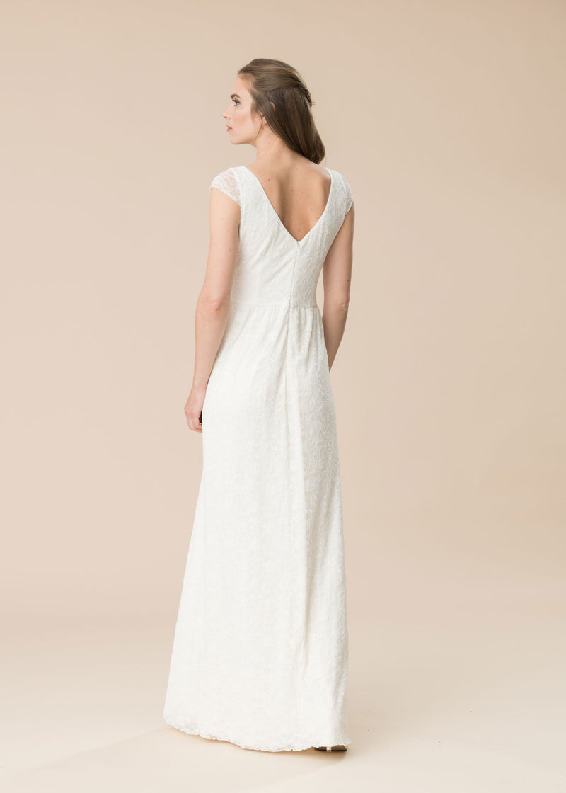 Schlichtes und elegantes Spitze-Hochzeitskleid welches sich perfekt für die Ziviltrauung eignet. Dieses Kleid ist im Baukasten erhältlich, es ist also in vielen verschiedenen Varianten erhältlich.